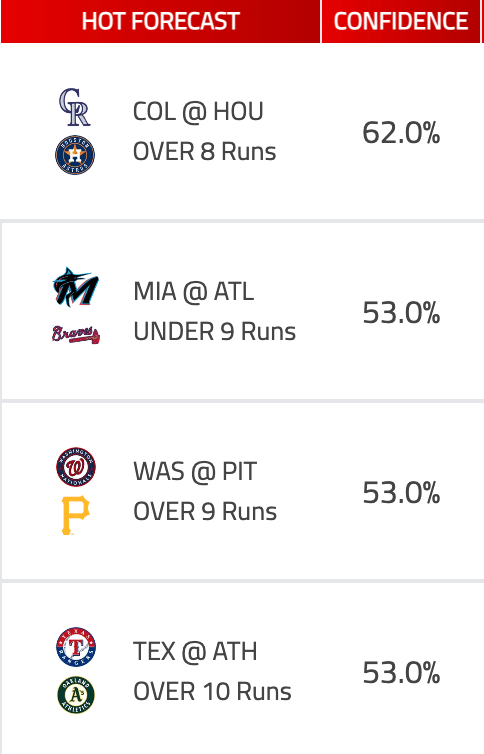 | TEX @ ATH | 9:40p | ATH 53¢ | ATH +1.5 @ 64¢ | 9.5 · O 51¢ |